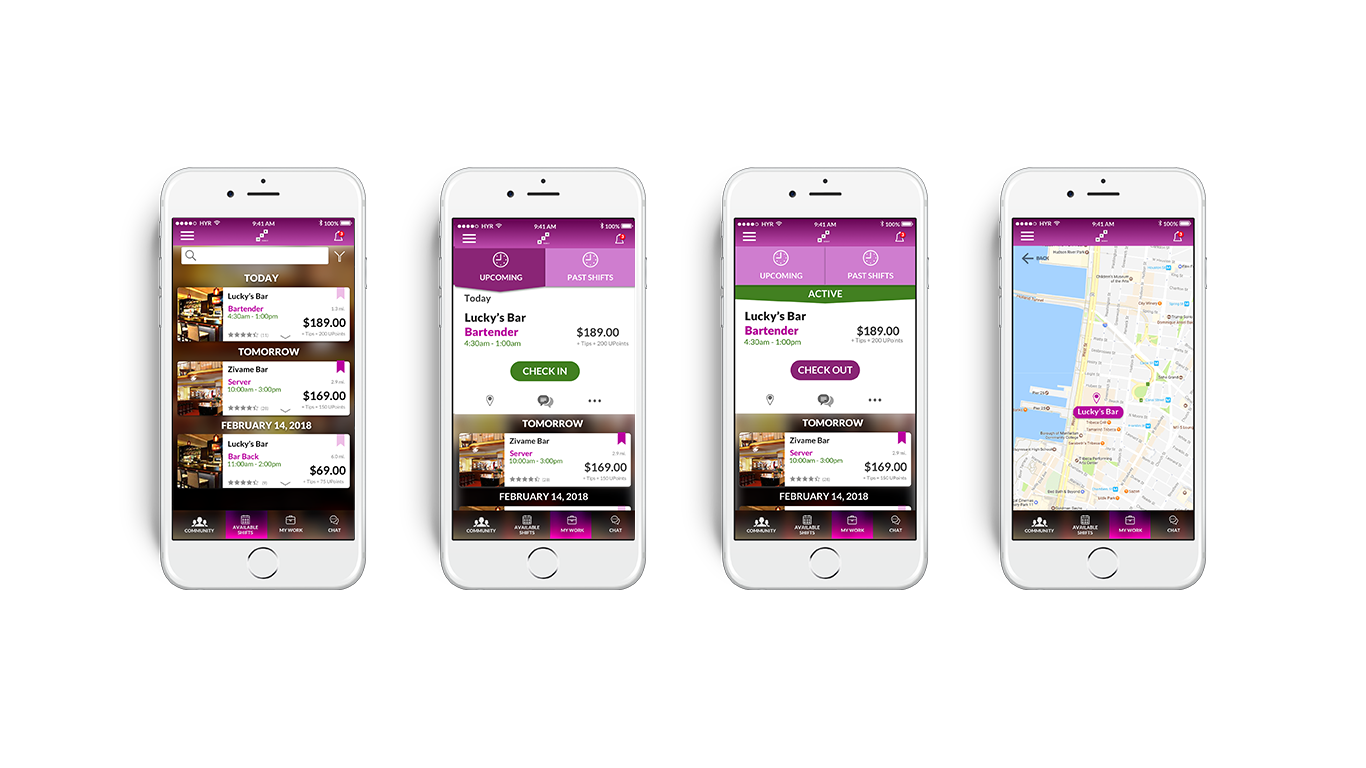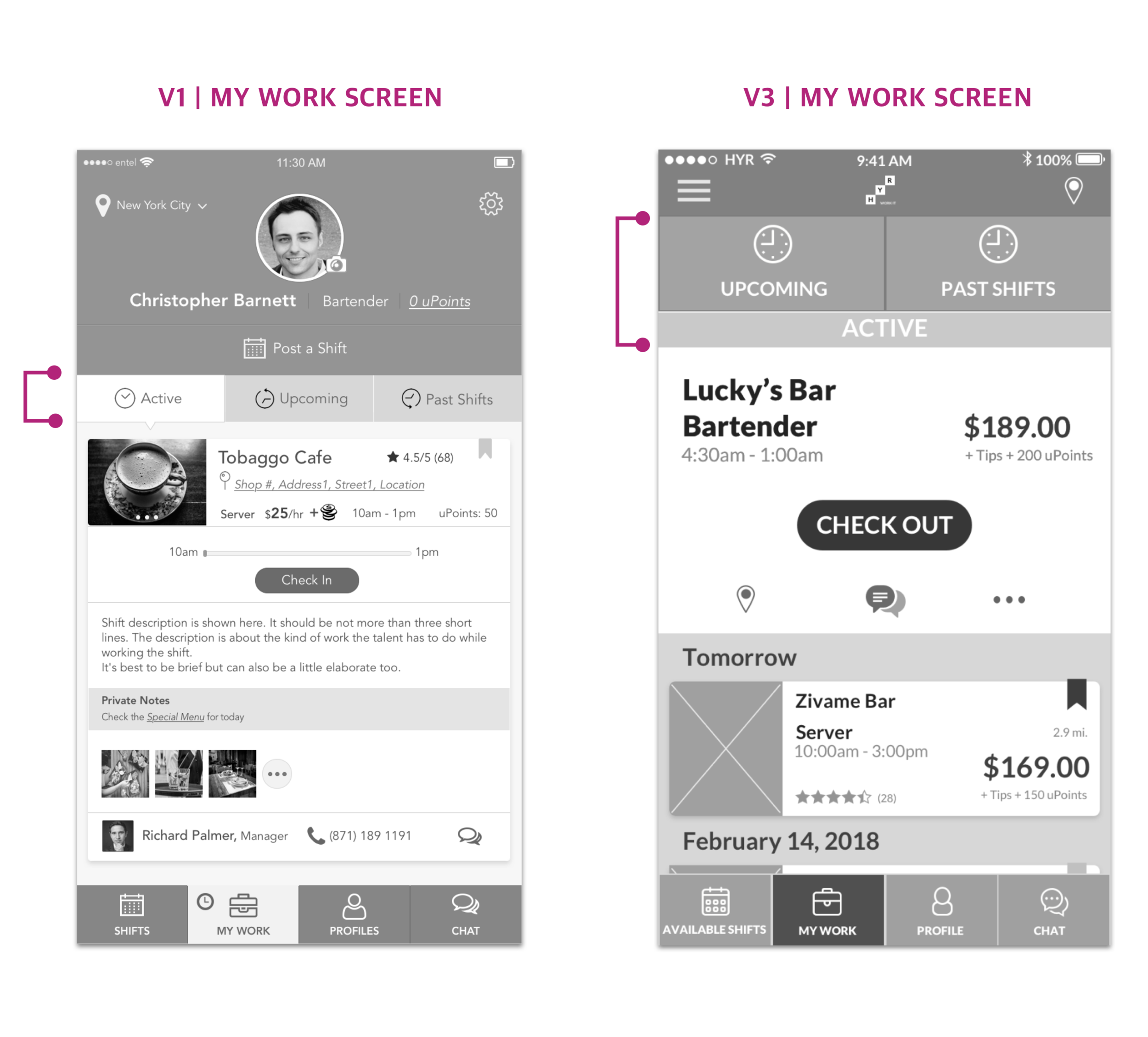 The initial UI was difficult to read, and users were confused about why upcoming shifts were listed under "Active." We revised the wireframes and removed the "Active" tab, which resolved the confusion and reduced user errors when checking into shifts.